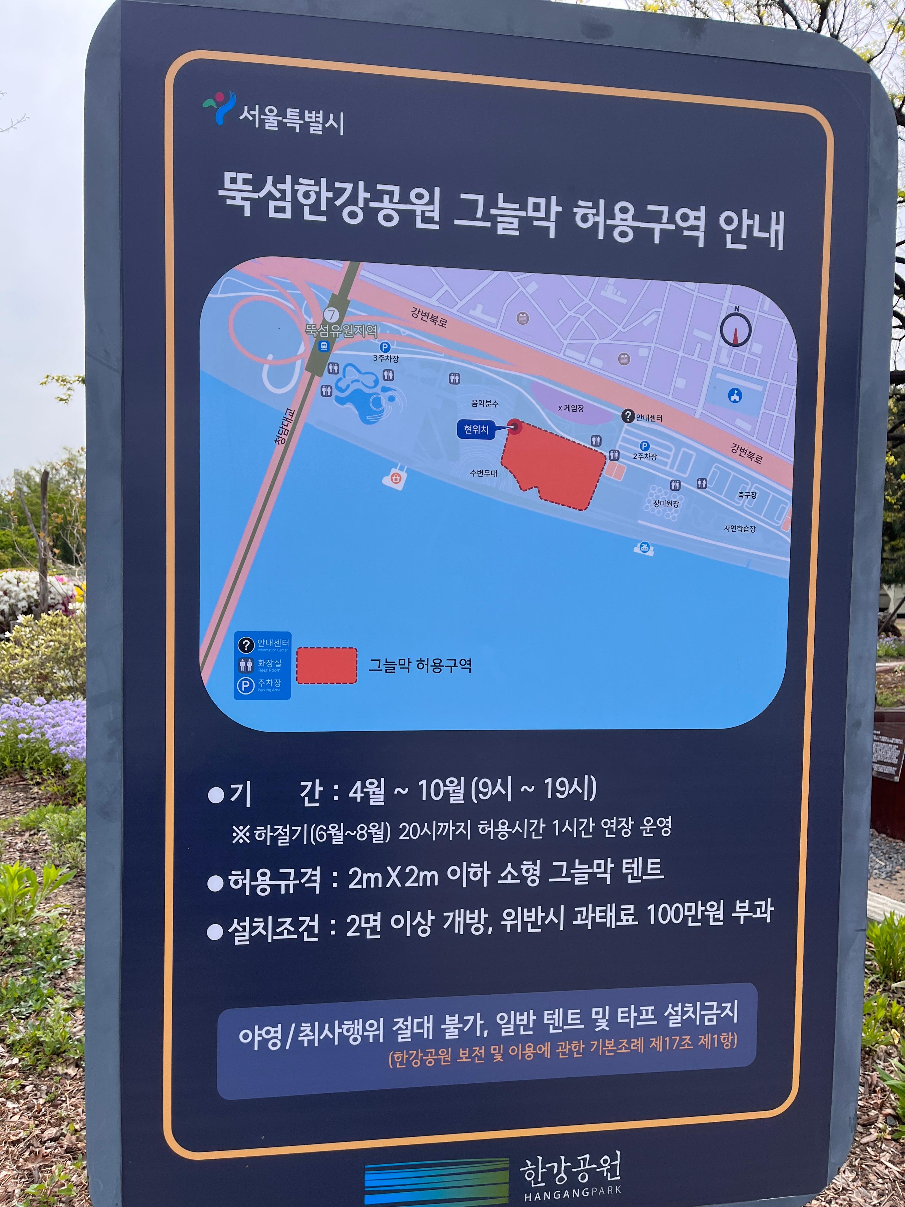 뚝섬한강공원의 그늘막 허용 구간을 확인하고 그쪽으로 갔습니다.